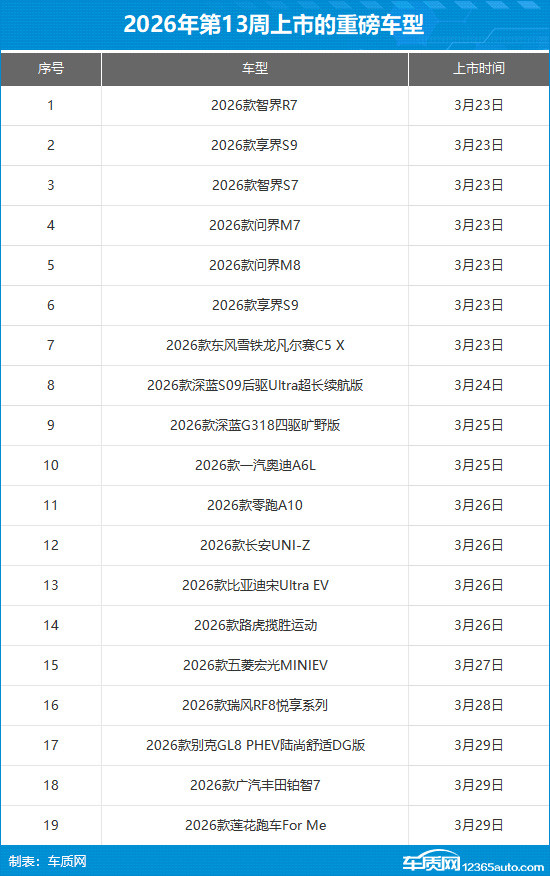 回顾上周国内车市,鸿蒙智行旗下2026款问界M7、智界R7以及享界S9等多款新车上市,全系标配新一代激光雷达,智能化配置拉满;比亚迪旗下备受关注的宋Ultra EV也迎来了上市,作为全球首款B级纯电闪充SUV,值得关注;零跑旗下全新小型SUV――零跑A10,标配高通8295芯片,性价比极高。接下来我们将对上周上市新车进行汇总,看看有没有您喜欢的!