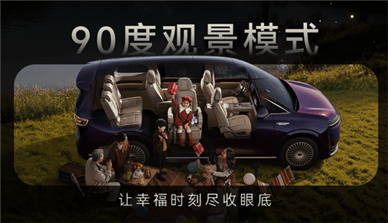 V9定位大型MPV,其长宽高为5359*2009*1859/1879mm,轴距为3250mm,采用2+2+3的布局,其中第二排为双独立座椅,可支持45°迎宾、90°观景和180°对坐,适配不同的用车场景。