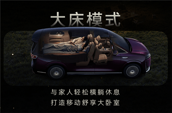 得益于灵活的座椅功能,新车支持大床模式,也就是将第三排座椅完全放倒,第二排座椅向后旋转,不过目测需要床垫辅助;比较有意思的是,第三排座椅靠摆可以向后完全放平,如此就能在车里放一些大件行李物品,提高车辆的装载灵活性。