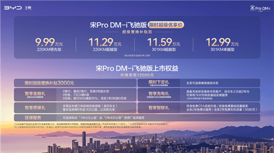 比亚迪宋Pro DM-i飞驰版正式上市,推出4款配置车型,超级优享价9.99万元-12.99万元。