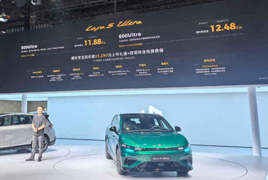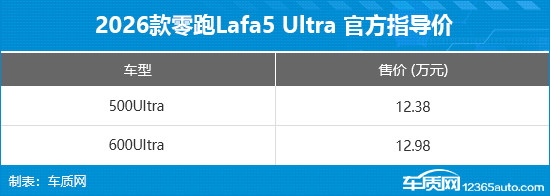 2026年4月24日,在北京车展现场,零跑Lafa5 Ultra正式上市。新车共推出2款车型,官方指导价12.38-12.98万元,上市限时惊喜价11.88-12.48万元。此外,官方还推出复购礼、补能礼等多项购车礼遇。