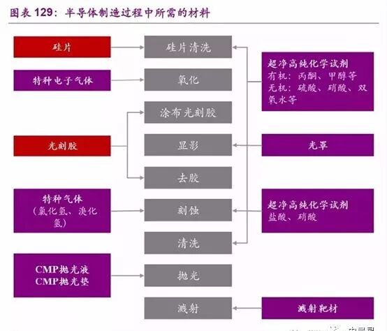 除晶圆材料外,制造材料可以分为以下几类:靶材,CMP 抛光材料、光刻胶、高纯试剂、电子特种气体、光掩膜等,硅片、气体、光掩模和光刻胶四种材料占整体比例 67% 以上