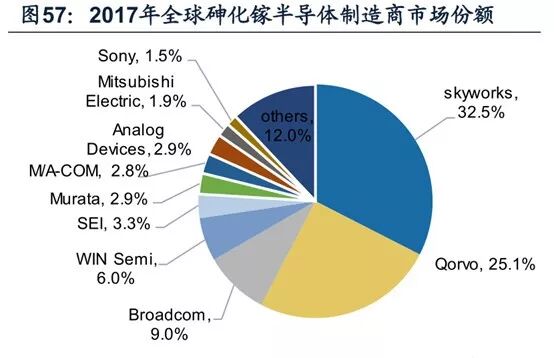 器件:2018 年全球 88.7 亿美元,前四大厂商占比达到73.4%,分别为Skyworks(32.3%)、Qorvo(26%)、Broadcom(9.1%)、稳懋半导体(6%),详细介绍请持续关注本公众号“史晨星”(shichenxing1)