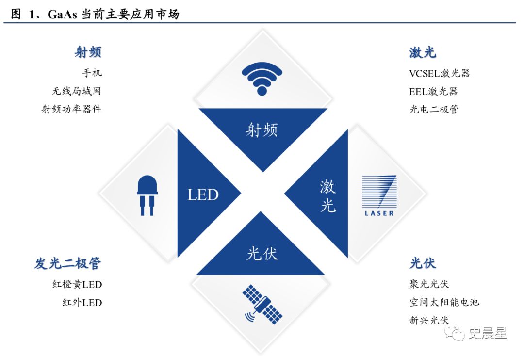 GaAs 主要用于高功率领域,应用于手机电话、无线局域网络、光纤通讯、卫星通讯、卫星定位等领域
