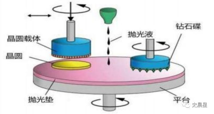 CMP 化学机械抛光(Chemical Mechanical Polishing) 是在一定压力及抛光液下,被抛光工件相对于抛光垫做相对运动,借助于纳米粒子的研磨作用与氧化剂的腐蚀作用之间的有机结合,在被研磨的工件表面形成光洁表面,应用在单晶硅片抛光及介质层抛光中,材料包括抛光液、抛光垫和修整盘等