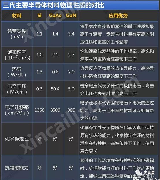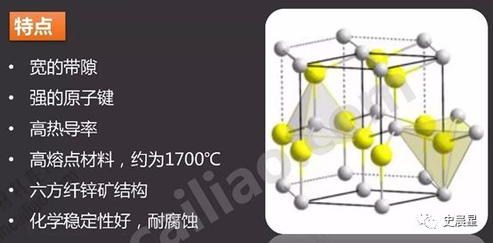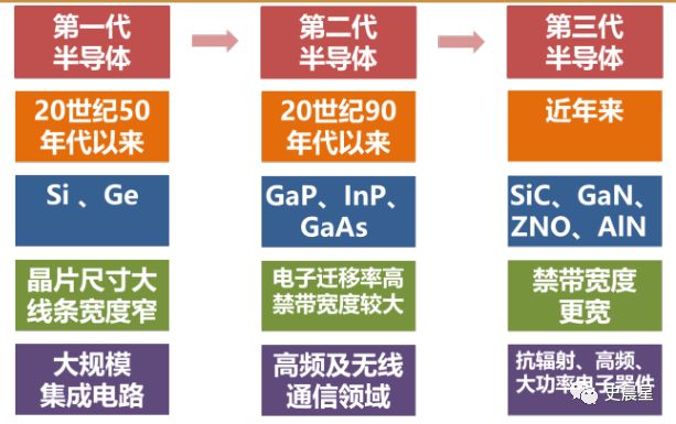 第三代半导体材料又被称为宽禁带高温半导体材料,主要包括碳化硅(SiC)、氮化镓(GaN)、氧化锌(ZnO)、金刚石、氮化铝(AlN)等,优点是禁带宽度大(>2.2ev)、击穿电场高、热导率高、抗辐射能力强、发光效率高、频率高,不会产生砷化镓(GaAs)、镓离子、铟离子等污染物,常用于高温、高频、抗辐射及大功率器件