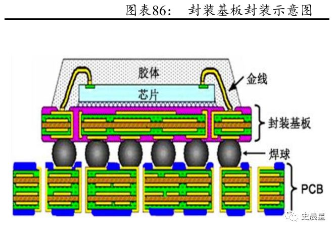 封装基板作为芯片封装核心材料,一方面能够保护、固定、支撑芯片,增强芯片导热散热性能,保证芯片不受物理损坏,另一方面封装基板的上层与芯片相连,下层和印刷电路板相连,以实现电气和物理连接、功率分配、信号分配,以及沟通芯片内部与外部电路等功能