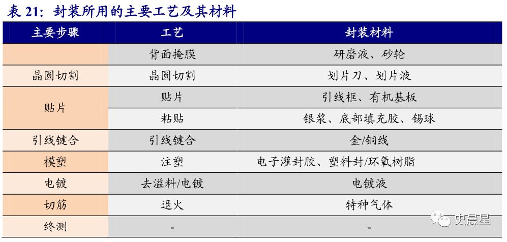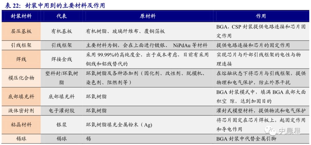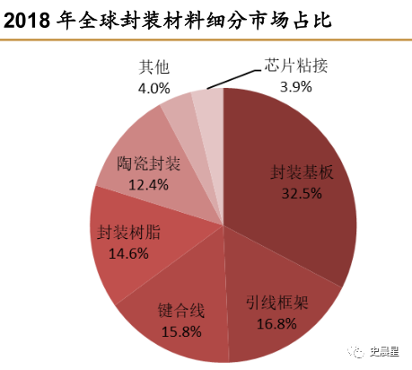 封装材料是指在晶圆上形成有引出管脚和钝化保护壳的独立芯片过程中用到的各类材料和工具,主要包含基板、引线框架、键合丝、陶瓷封装材料、封装树脂、粘晶材料等