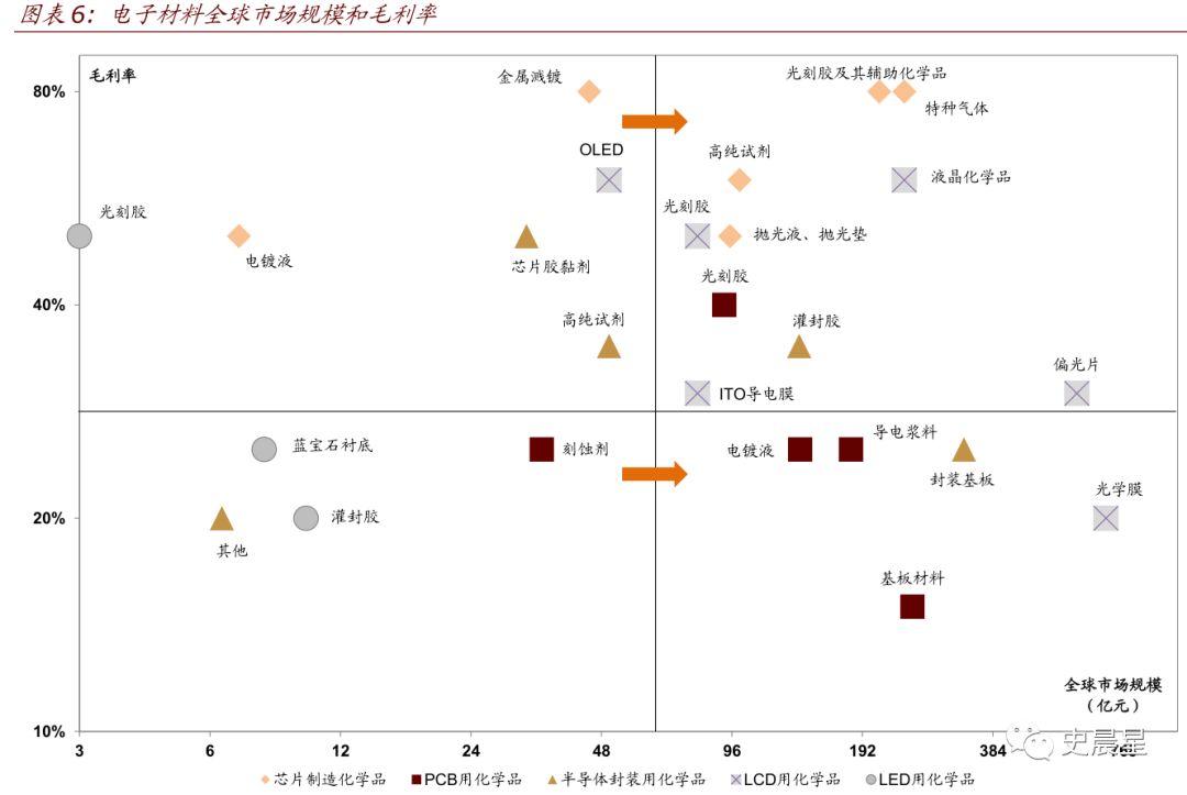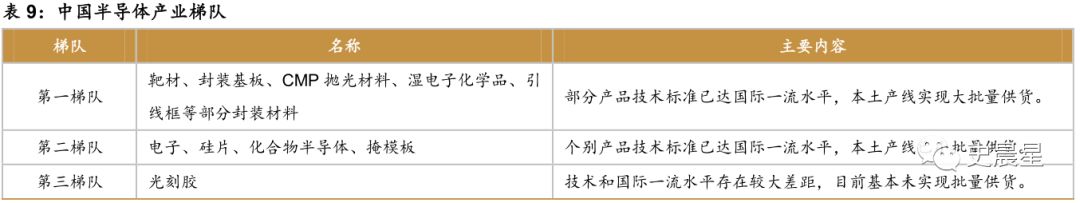 第一梯队:靶材、封装基板、CMP 抛光材料、湿电子化学品,引线框等部分封装材料,部分产品技术标准达到全球一流水平,本土产线已实现中大批量供货