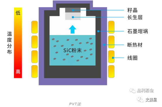 PVT 类似锅盖上的水蒸气凝结过程,加热碳化硅粉体,然后利用温度梯度差,在顶部凝结生长晶体