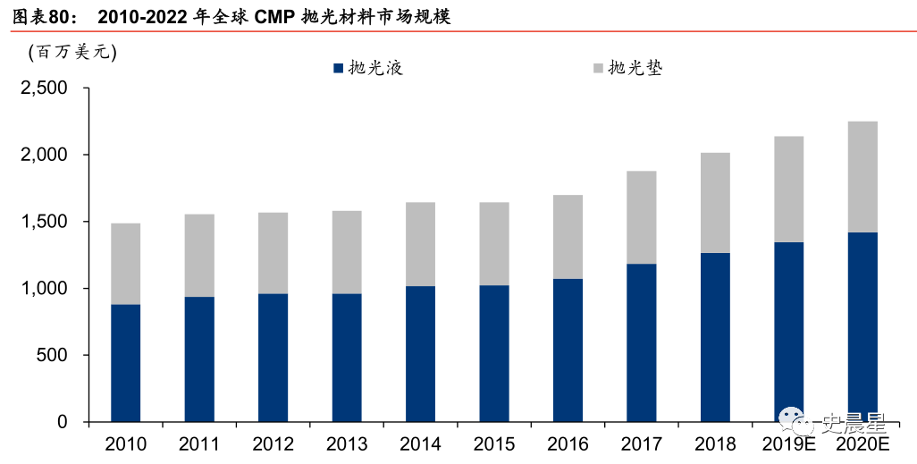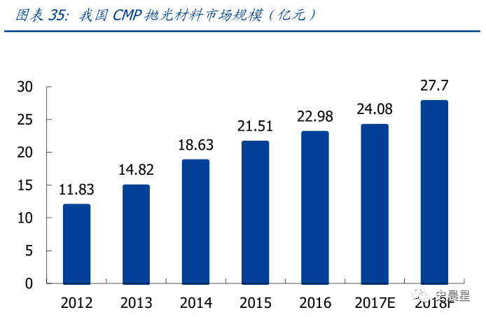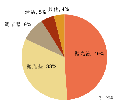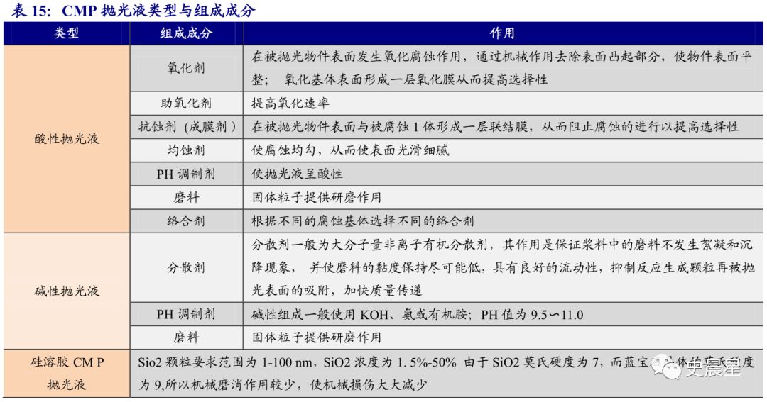 抛光液主要是为抛光对象提供研磨及腐蚀溶解,一般由超细固体粒子研磨剂(如纳米级 SiO 2 、Al 2 O 3 粒子等)、表面活性剂、稳定剂、氧化剂等组成,技术壁垒在于调整抛光液组成以改善抛光效果