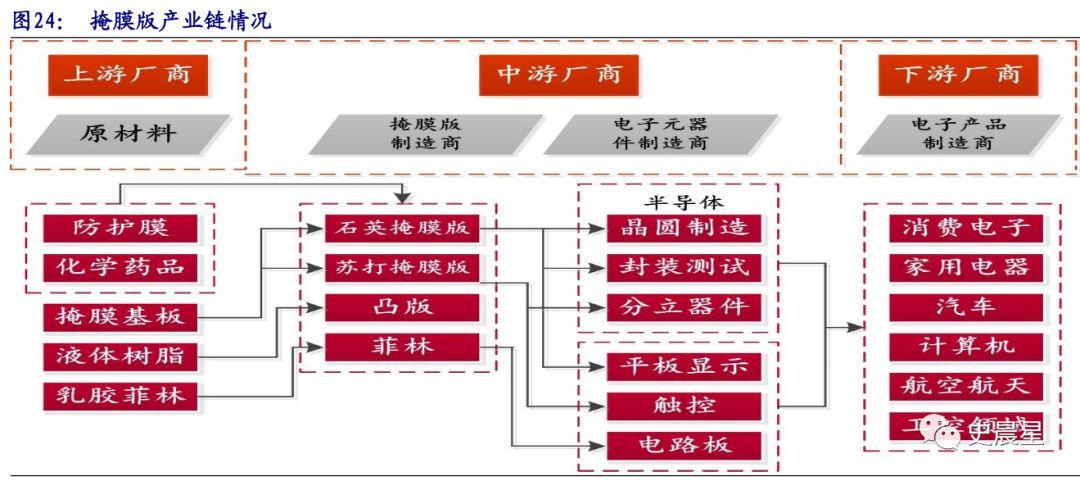 英特尔、三星、台积电三家全球最先进的芯片制造厂,其所用的掩膜版大部分由自己的专业工厂生产,非先进制程掩膜版外包趋势明显,全球美国福尼克斯 Photronic、日本 DNP 、日本凸版印刷 Toppan、台湾光罩、SK-Electronics等