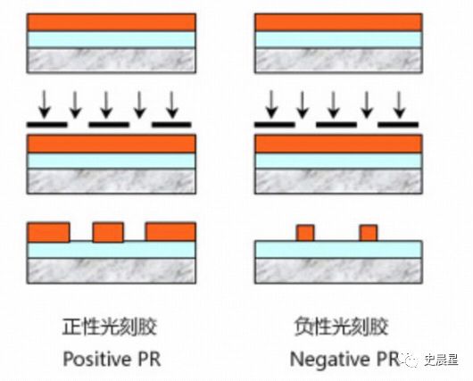 在光刻工艺中,光刻胶被均匀涂布在衬底上,经过曝光(改变光刻胶溶解度)、显影(利用显影液溶解改性后光刻胶的可溶部分)与刻蚀等工艺,将掩膜版上的图形转移到衬底上,形成与掩膜版完全对应的几何图形,技术分类:正性、负性
