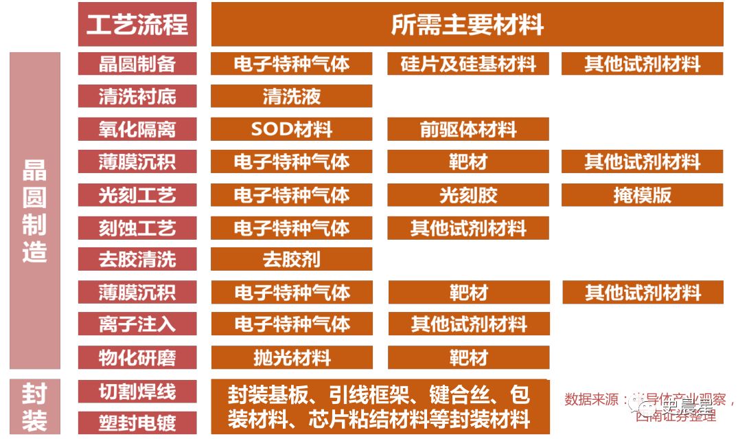 半导体材料处于产业链上游,支撑制造和封装测试,一代技术依赖于一代工艺,一代工艺依赖一代材料和设备来实现,具有产业规模大、细分行业多、技术门槛高、成本占比低等特点