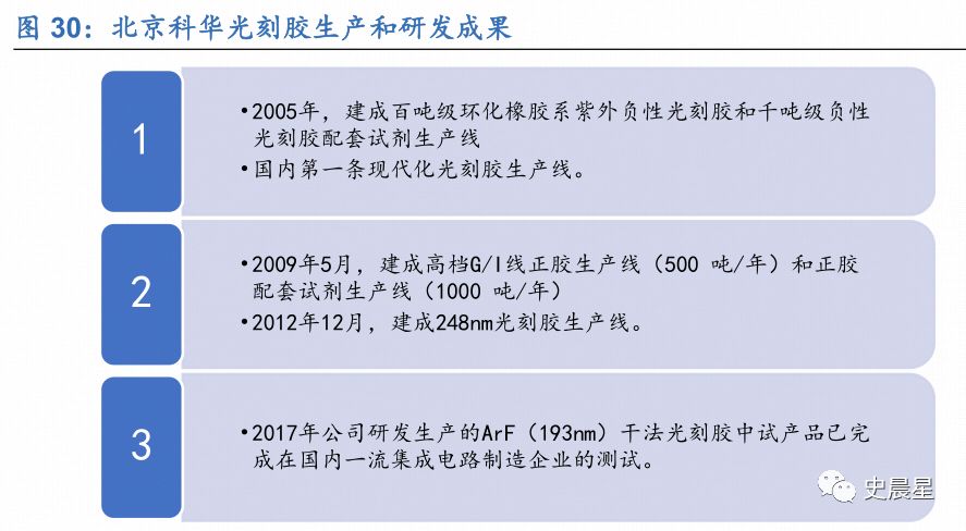 北京科华成立于 2004 年 8 月,I 线365nm光刻胶产能 500 吨/年、KrF 248nm 光刻胶产能10 吨/年,ArF 193nm 干法光刻胶中试产品完成测试,EUV 13.5nm 光刻胶完成关键材料设计、制备和合成工艺研究、配方组成和制备,与国际先进水平只差一代