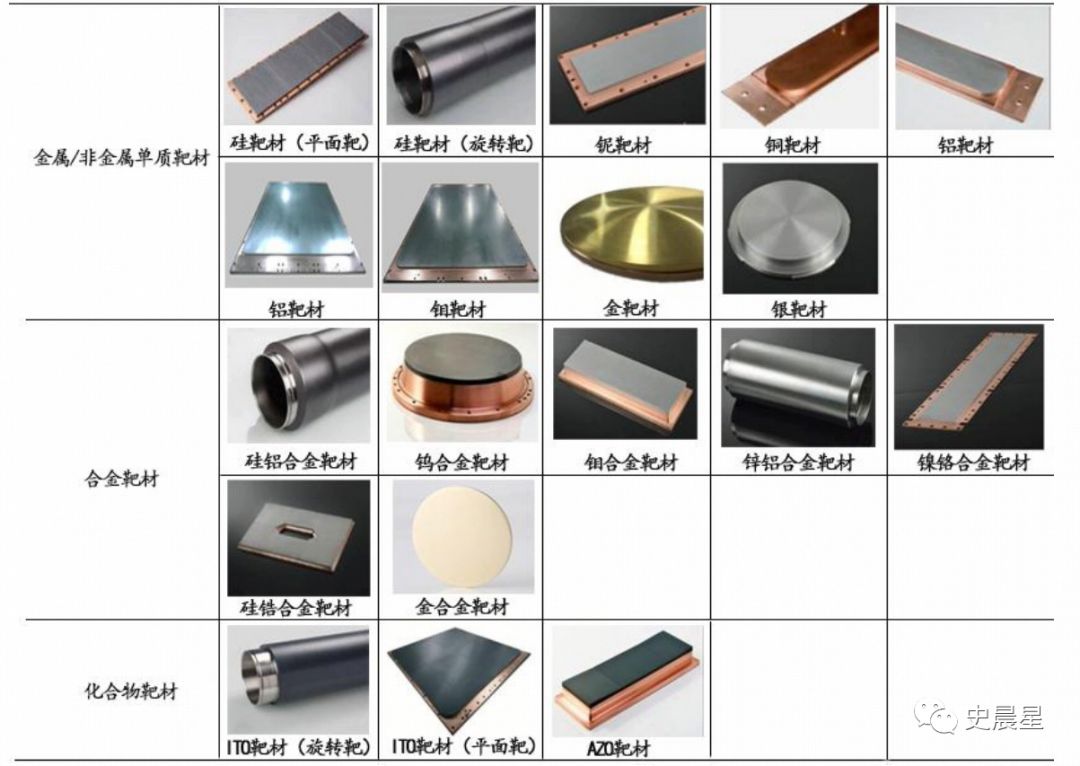 按照成分不同可分为金属靶极(纯金属铝、钛、铜、钽等)、合金靶极(镍铬合金、镍钴合金等)和陶瓷化合物靶极(氧化物、硅化物、碳化物、硫化物等)