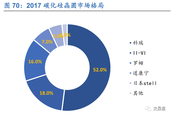 衬底:美国科锐Cree、II-VI、Dow Dcorning,日本罗姆 Rohm、Stell 等,中国山东天岳、天科合达、河北同光、北京世纪金光、中科节能、中电科装备等