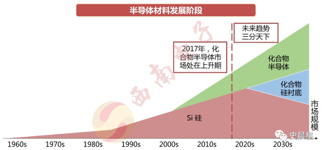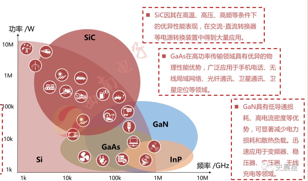 各种半导体材料形成互补关系,Si 适用于数字逻辑芯片、存储芯片等,GaN、GaAs、InP 适用于高频领域,SiC 适用于高压领域