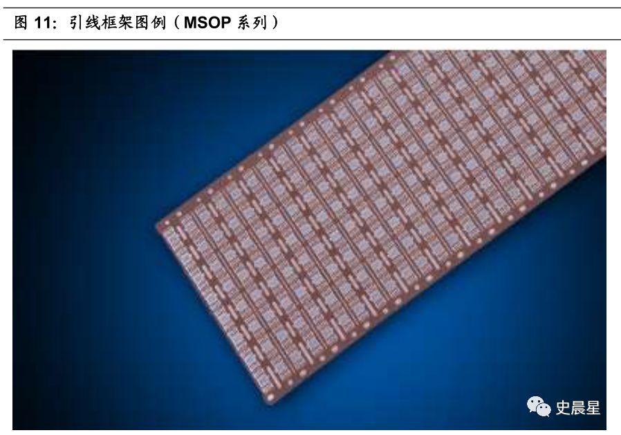 引线框架是一种借助于键合丝实现芯片内部电路引出端与外部电路(PCB)的电气连接,形成电气回路的关键结构件,类型有 TO、DIP、SIP、SOP、SSOP、QFP、QFN、SOD、SOT 等,主要用模具冲压法和蚀刻法进行生产,国内康强电子等