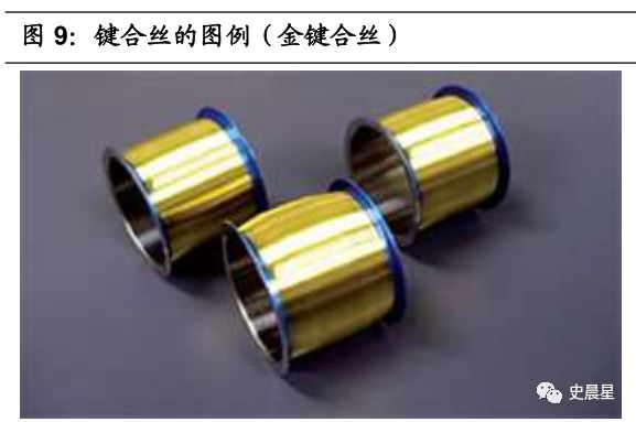 键合丝是用来焊接连接芯片与支架,承担着芯片与外界之间关键的电连接功能,根据应用领域以及需求的不同,可以选择金、银、铜、铝各种不同的金属复合丝,全球市场规模 35 亿美元,中国 45 亿元,全球日本贺利氏、田中贵金属、新日铁等,中国康强电子等