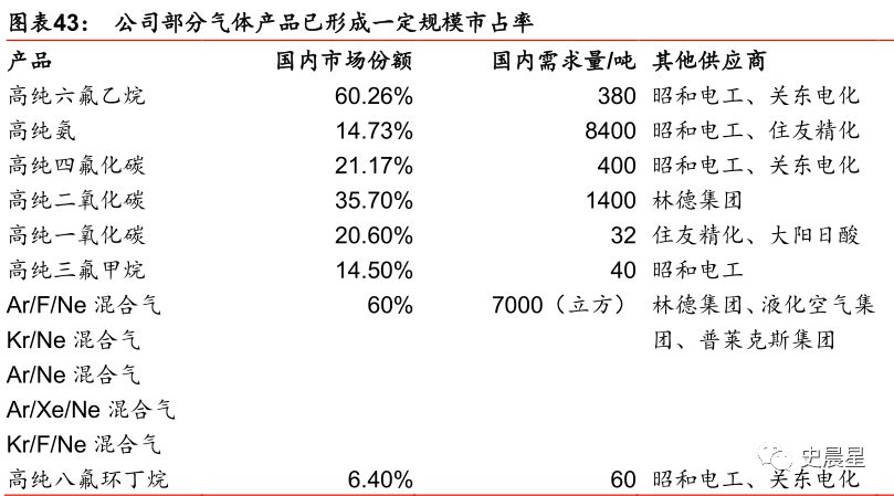 1999 年成立于广东省佛山市南海区里水镇,主营工业气体生产,以氟碳类气体见长,2017 年 Ar/F/Ne、Kr/Ne、Ar/Ne 和 Kr/F/Ne 等 4 种混合气通过全球最大的光刻机 ASML 产品认证,中国第一,全球前四,2019年登陆科创板