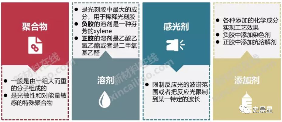光刻胶由感光树脂、增感剂、溶剂三种主要成份组成、对光敏感的混合液体。利用光化学反应,经曝光、显影、刻蚀等工艺将所需要的微细图形从掩模版转移到待加工基片上的图形转移介质