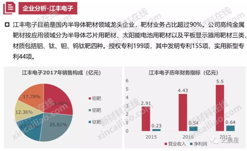 江丰电子主营高纯溅射靶材的研发、生产和销售,主要有四种:铝、钛、钽、钨钛靶,应用于半导体、平面显示以及太阳能等,在14/16 纳米技术节点实现批量供货,完成国家 02 重大专项(300mm 硅片工艺用Al、Ti、Ta 靶材制造技术研发与产业化)项目验收