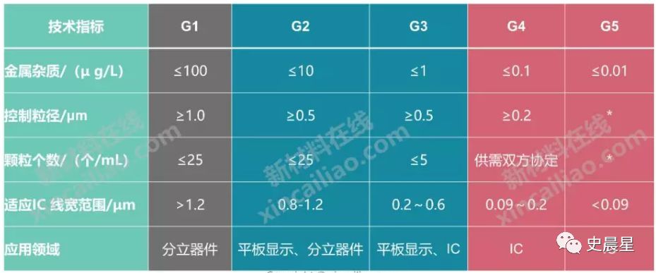湿电子化学品杂质含量标准 SEMI 国际标准分为五个等级,集成电路用超高纯试剂集中在 G3、G4、G5 水平