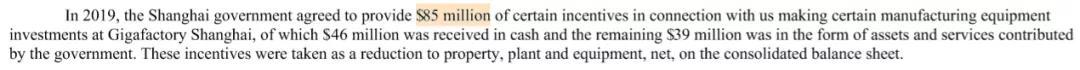 不止如此,2019年报显示,当年,上海政府向特斯拉提供了价值约8500万美元(约合5.9亿元人民币)的“某些补助”(certain incentives),作为其上海工厂的制造设备投资。