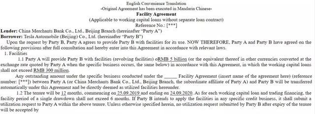 ○2019年9月,特斯拉上海公司与招商银行北京分行签署50亿元人民币的无抵押循环贷款(如下图),贷款期12个月,利率不高于央行年基准利率的90%。