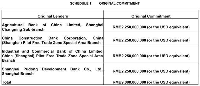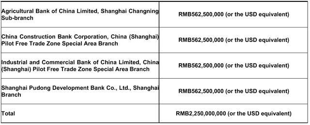 该报告显示,90亿元人民币的担保定期贷款来自农业银行上海长宁支行、建设银行上海自贸试验区分行、工商银行上海自贸试验区分行和上海浦东发展银行上海分行,借款金额分别为22.5亿元人民币。