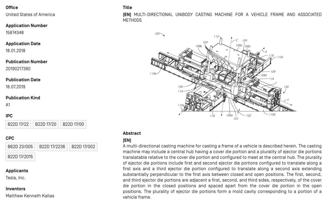 2019 年 7 月,据 electrek 报道,特斯拉有一台巨大的新机器,几乎可以生产 Model Y 的一整个白车身。回顾该专利,其编号为 US20190217380,名为车架多方向一体铸造机及相关方法。