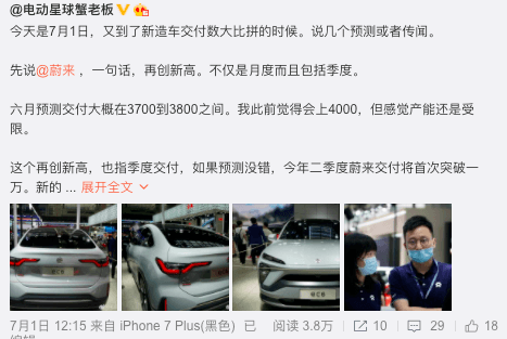 从今天公布情况来看,我的预测更准一点。但也留了一个尾巴,7、8 月的交付,蔚来会不会下降?