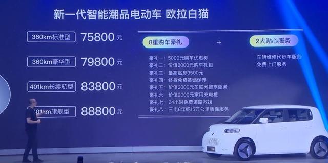 在7月15日,欧拉白猫正式上市,新车共推出4款车型,补贴后售价区间为7.58-8.88万元。