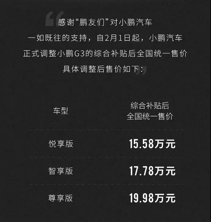 小鹏汽车率先宣布调价:自2019年2月1日起,综合补贴后全国统一售价为悦享版15.58万元、智享版17.78万元、尊享版19.98万元。相比上市之初的价格分别上调2万元、2.8万元、3.4万元。