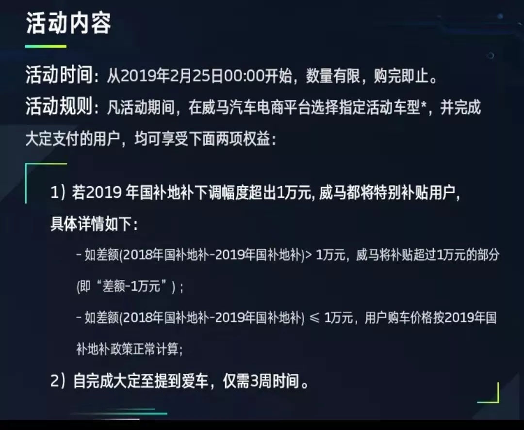 威马汽车还推出了“威马EX5保价优选直通车”活动,自2月25日起参与大定支付的用户,若2019年国补地补下调幅度超过1万元,威马都将补贴超出的部分。活动限量提供优选车型,购完即止。
