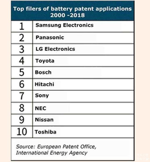 在2000年至2018年间,日本公司占据了申请主体TOP10中的7名,但韩国三星电子则以4787项发明位列第一。特斯拉电池供应商松下以4046位居第二;其次是LG电子,专利申请量为2999;丰田排在第四位;日立、索尼和其他日本公司在前10名中排名较低。