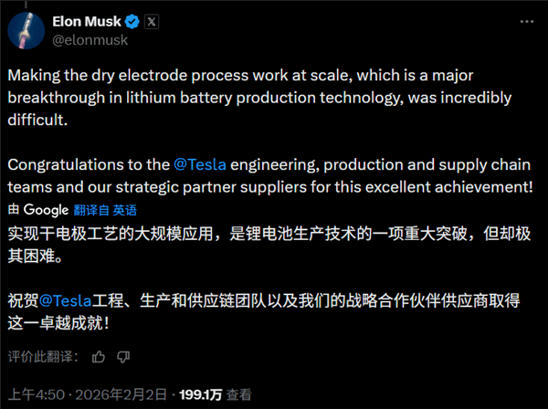 【Techweb】特斯拉在锂电池生产领域取得了重大技术突破。埃隆•马斯克在X平台上发文称,实现干电极工艺的大规模应用是锂电池生产技术的一项卓越成就,同时也极具挑战性。他向特斯拉的工程、生产和供应链团队以及战略合作伙伴供应商表示了热烈祝贺。
