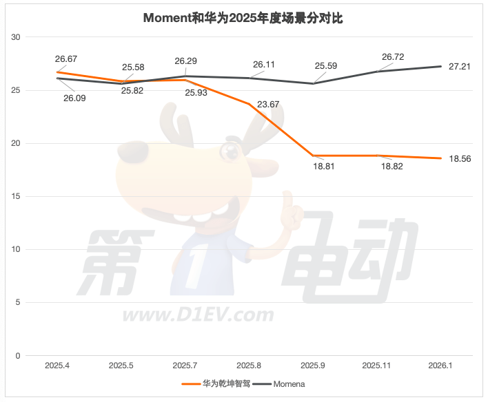 从7次测试的累计场景分来看,Momenta总场景分183.59分、均分26.23分,位居智驾天梯榜2025年度场景榜第四;华为乾坤智驾总场景分158.28分,均分为22.61分,位居智驾天梯榜2025年度场景榜第七。