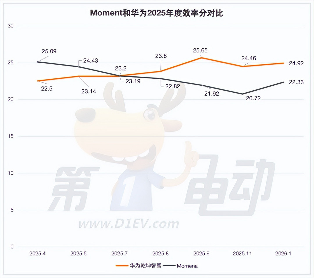 2026年1月,Momenta效率得分迎来回升,较2025年11月提升1.61分至22.33分,与华为在该模块的分值差距进一步收窄。这一增长得益于赛事数据核算的一增一减:新增的1月温州站中,Momenta 合作车型效率扣分大幅收窄,智己预赛仅扣2分、决赛扣4分,别克预赛扣8分,腾势预赛扣3分;而根据赛事规则被剔除的2025年6月无锡站及同期深圳、佛山路线中,智己、腾势曾出现高额扣分 —— 无锡站智己扣12分、腾势扣28分,深圳、佛山路线智己更是分别被扣13分、16分。低扣分新数据纳入,叠加高扣分旧数据剔除,综合推动Momenta效率均分实现正向增长。