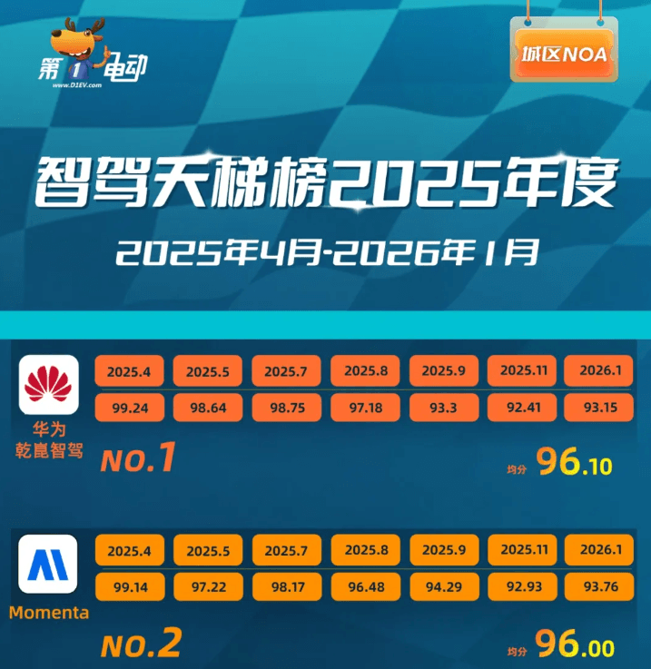 尽管下半年遭遇复杂场景适配的挑战,且被Momenta实现连续三个月的反超,但华为乾崑智驾仍凭借全年的稳定表现锁定年度冠军。依托在安全和效率两大核心模块的超强发挥,华为拿下96.10分的年度平均得分,在2025智驾天梯榜年度总榜中稳居第一,其核心技术优势仍未被撼动。