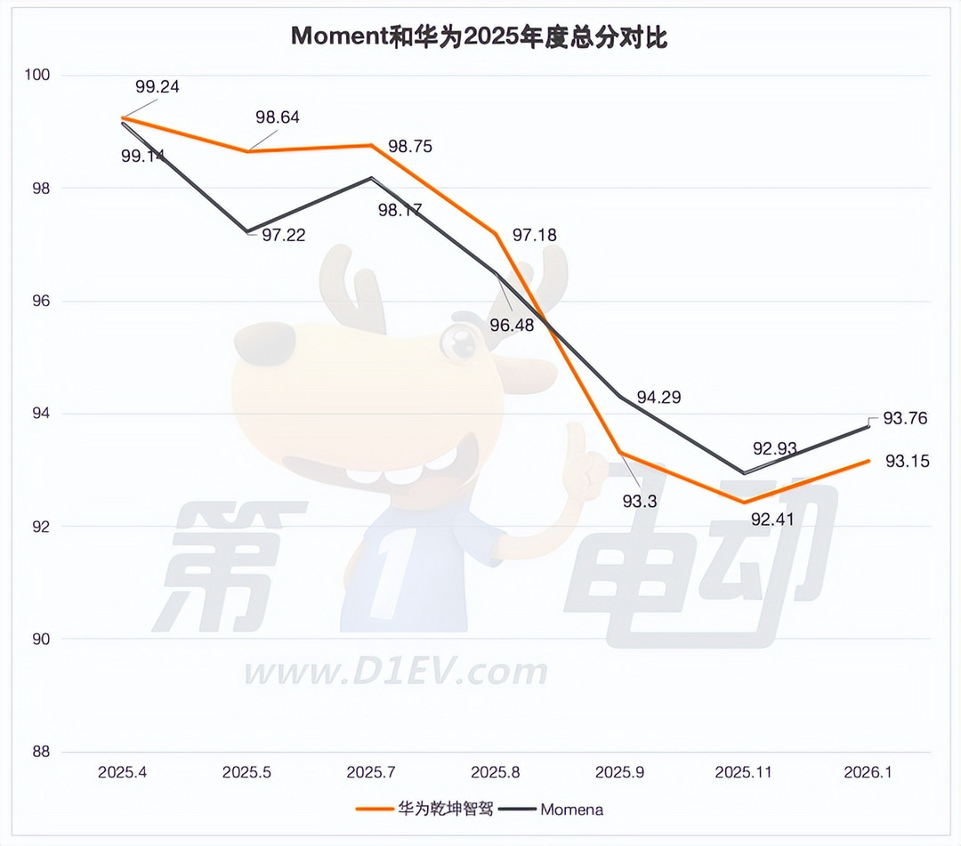 9月成为双方排名格局的转折点,华为当月测试总分跌至93.30分,较8月大幅下滑 3.88 分,这也是其年度总成绩首次被Momenta反超。核心原因是华为系车型在嘉兴站智驾大赛中,因园区小路场景无法激活 NOA 功能遭遇大量扣分,旗下车型集体跌出前十,而这也是华为智驾下半年因复杂场景适配不足导致分值下滑的典型体现。