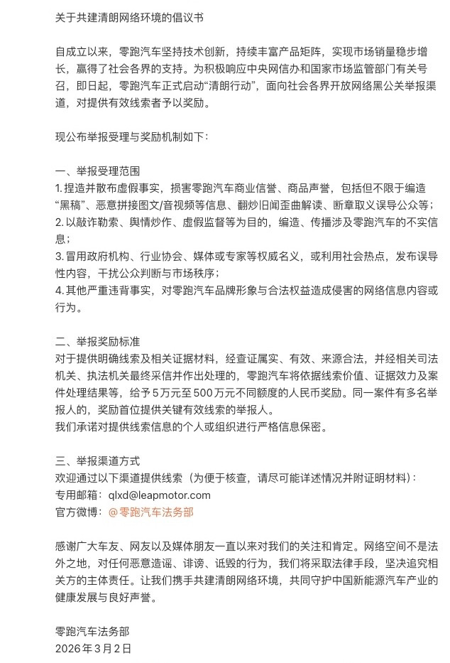 【TechWeb】3月2日消息,零跑汽车通过官方微博宣布正式启动"清朗行动",面向社会各界开放网络黑公关举报渠道,并设立高额奖励机制。根据公告,对于提供有效线索者,零跑汽车将给予5万元至500万元人民币不等的奖励。