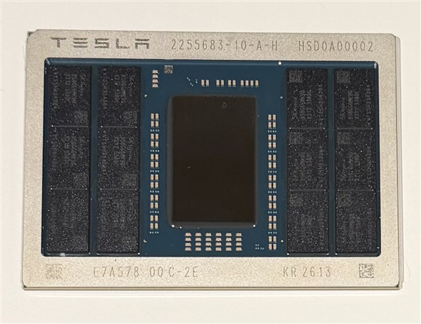 公开的芯片实物照显示,AI5芯片中间是一块大型核心裸片,负责承担全部计算任务。芯片外围排布了12颗DRAM内存模块,均来自SK海力士。这套设计能实现高内存容量,同时完成效率优先的带宽优化。