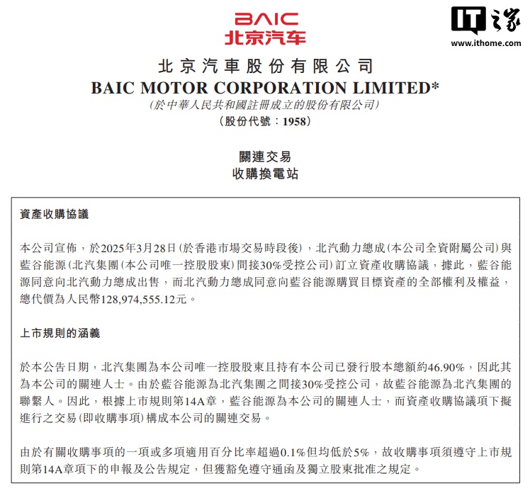 3月29日,北京汽车发布公告,宣布其全资子公司北汽动力总成与蓝谷能源达成资产收购协议。根据协议,蓝谷能源将向北汽动力总成出售40座换电站的设备及配套资产,总交易金额为人民币128,974,555.12元。