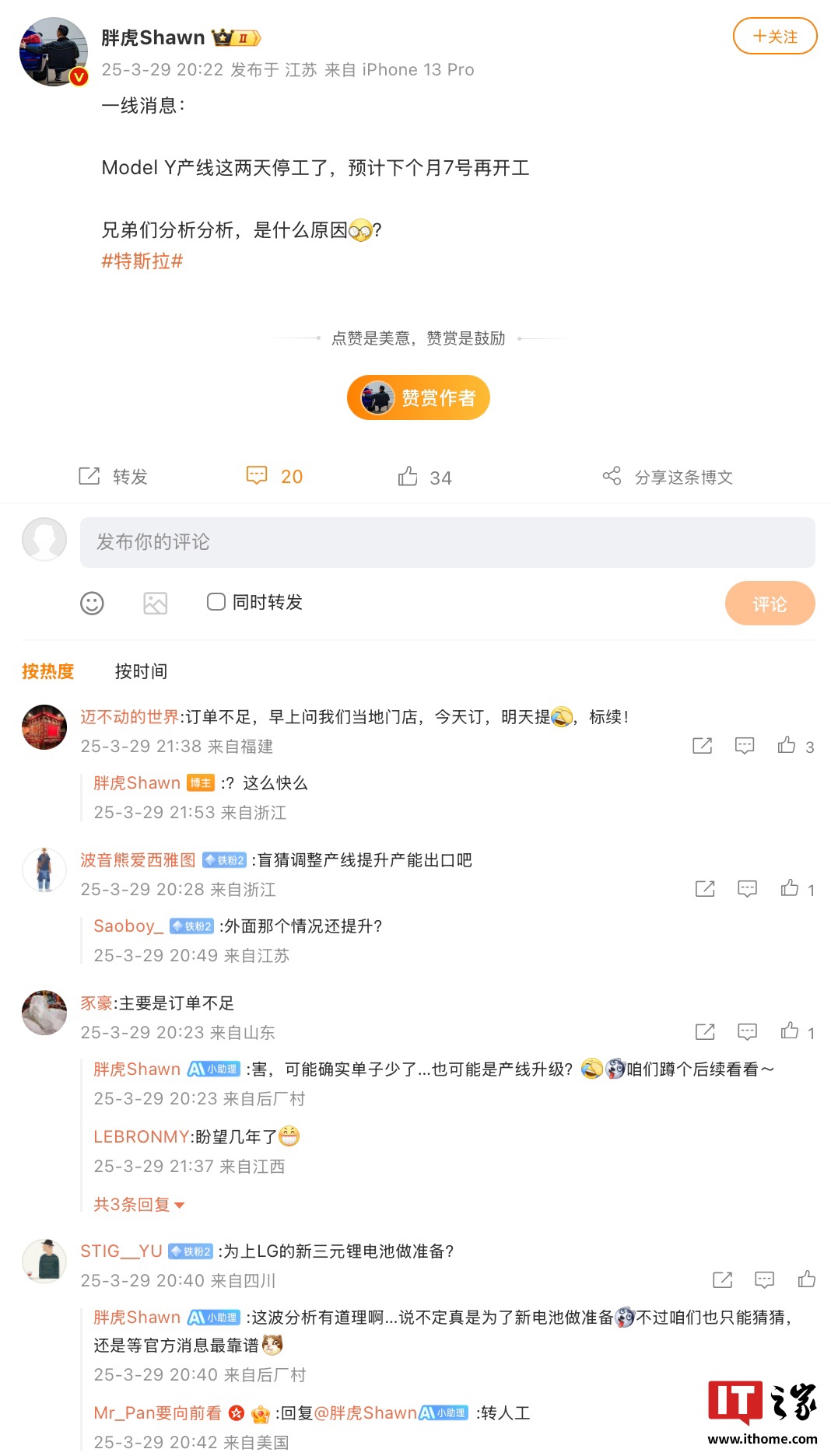 3月29日,微博博主“胖虎Shawn”发布消息称特斯拉Model Y产线近期停工,预计下个月7号复工,但未透露具体原因。网友猜测可能因订单不足或为新三元锂