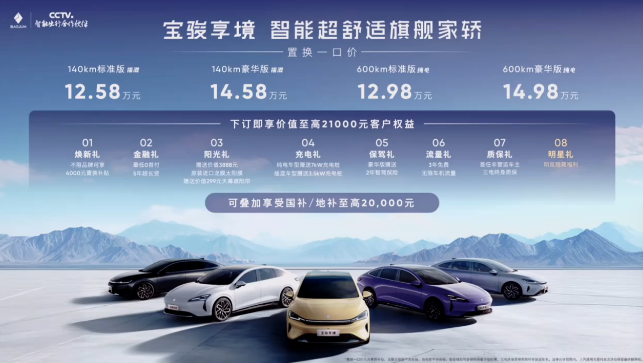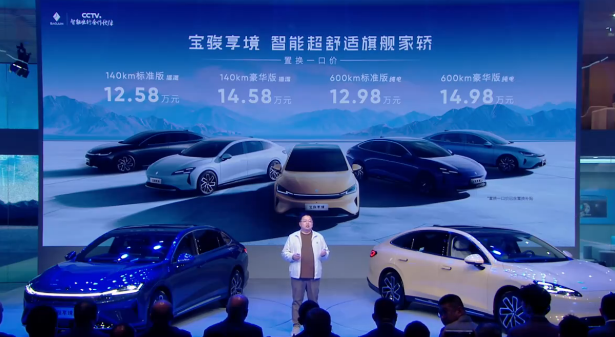 4月23日,宝骏享境纯电/插混轿车在2025上海车展正式上市,置换一口价12.58万元起,预售价13.28万元起。预售17天订单已突破5000台。新车配备家族化流星大灯、独有闪电大灯,全系标配高阶智驾行车灯。提供照夜白、超影灰、乌雅黑、翔麟紫、玉顶黄五款配色。