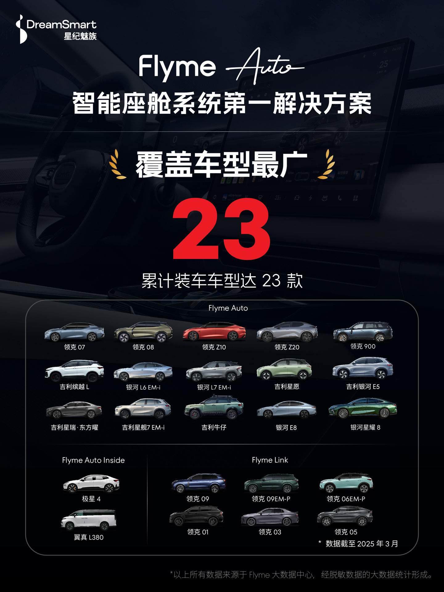Flyme Auto车载软件系统于2023年3月发布,支持无缝接力、手机辅助OTA、手机-汽车硬件互通共享硬件能力,支持手机寻车,以及平行视窗、小窗展示、跨端可见即可说等软件功能。
