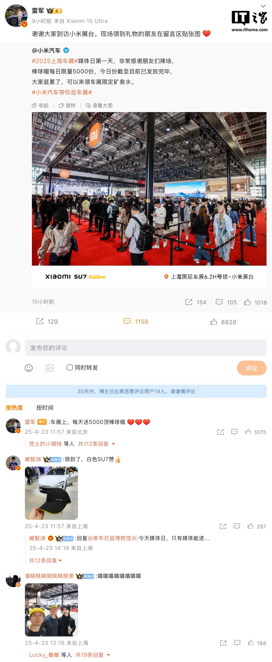 小米汽车官方微博宣布,展台将提供限量5000份的限定棒球帽和矿泉水作为礼物。雷军也转发了这条微博,邀请现场观众在留言区分享收到礼物的照片。小米展台的人气和互动活动,展现了品牌在新能源汽车领域的吸引力和影响力。