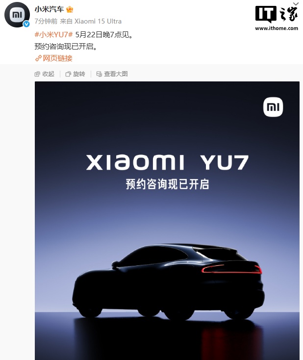 5月19日,小米汽车宣布其15周年战略新品发布会将于5月22日晚7点举行,主题为“新起点”。此次发布会将推出小米YU7车型,中文命名为“小米御7”,寓意“陆地战车,御风而行”。该车型已现身工信部,提供单电机和双电机版本,
